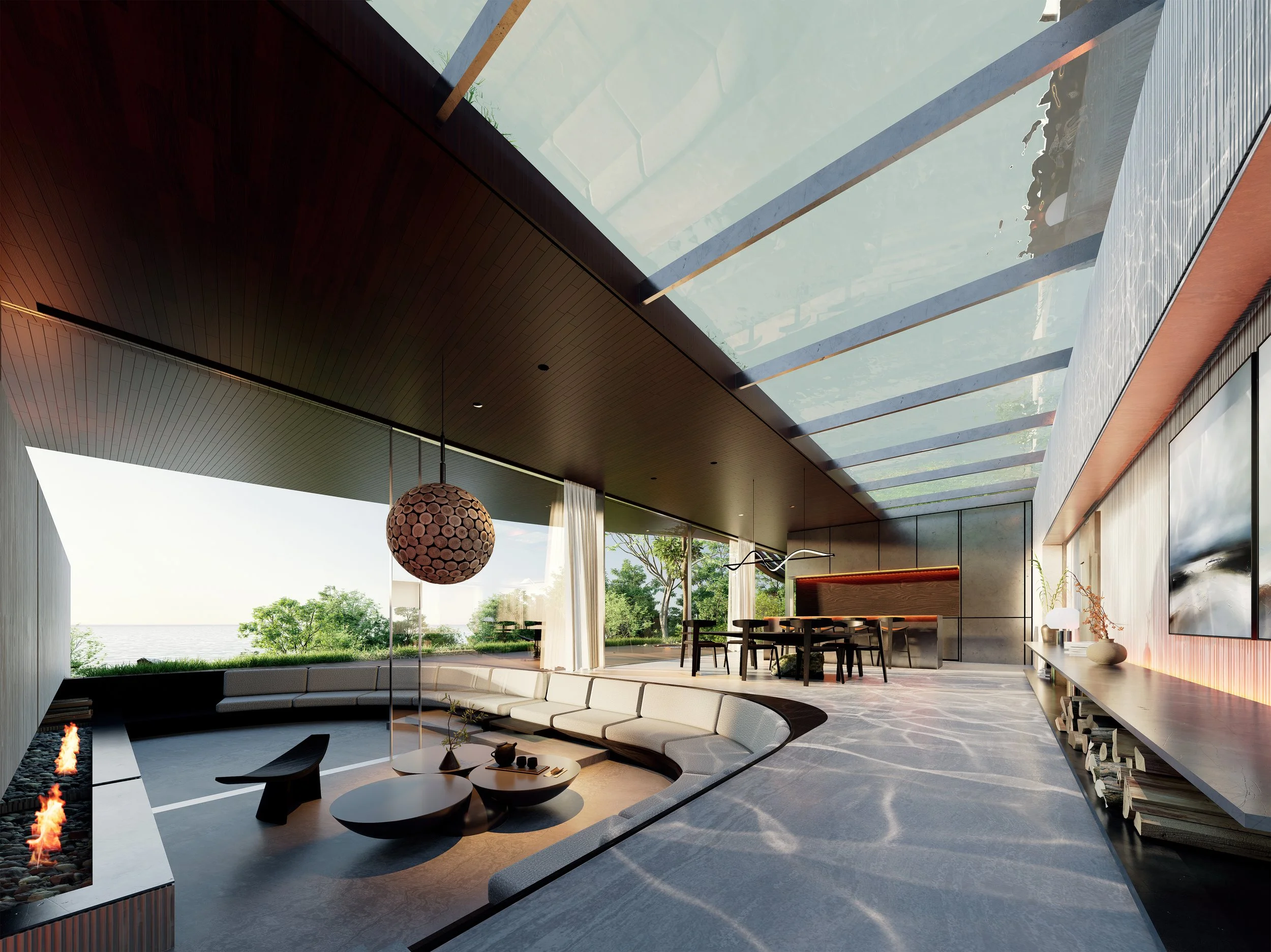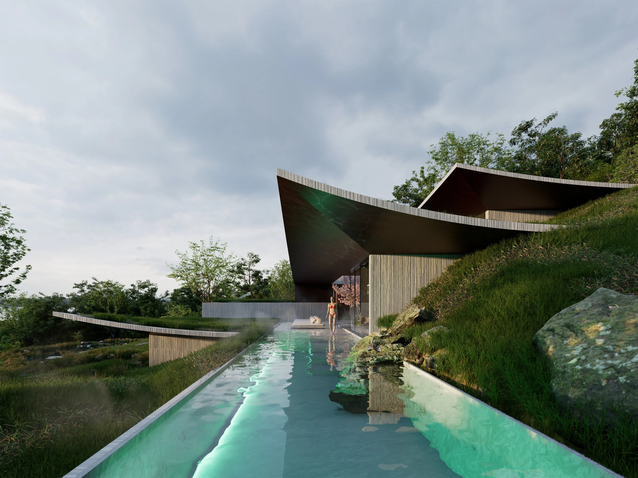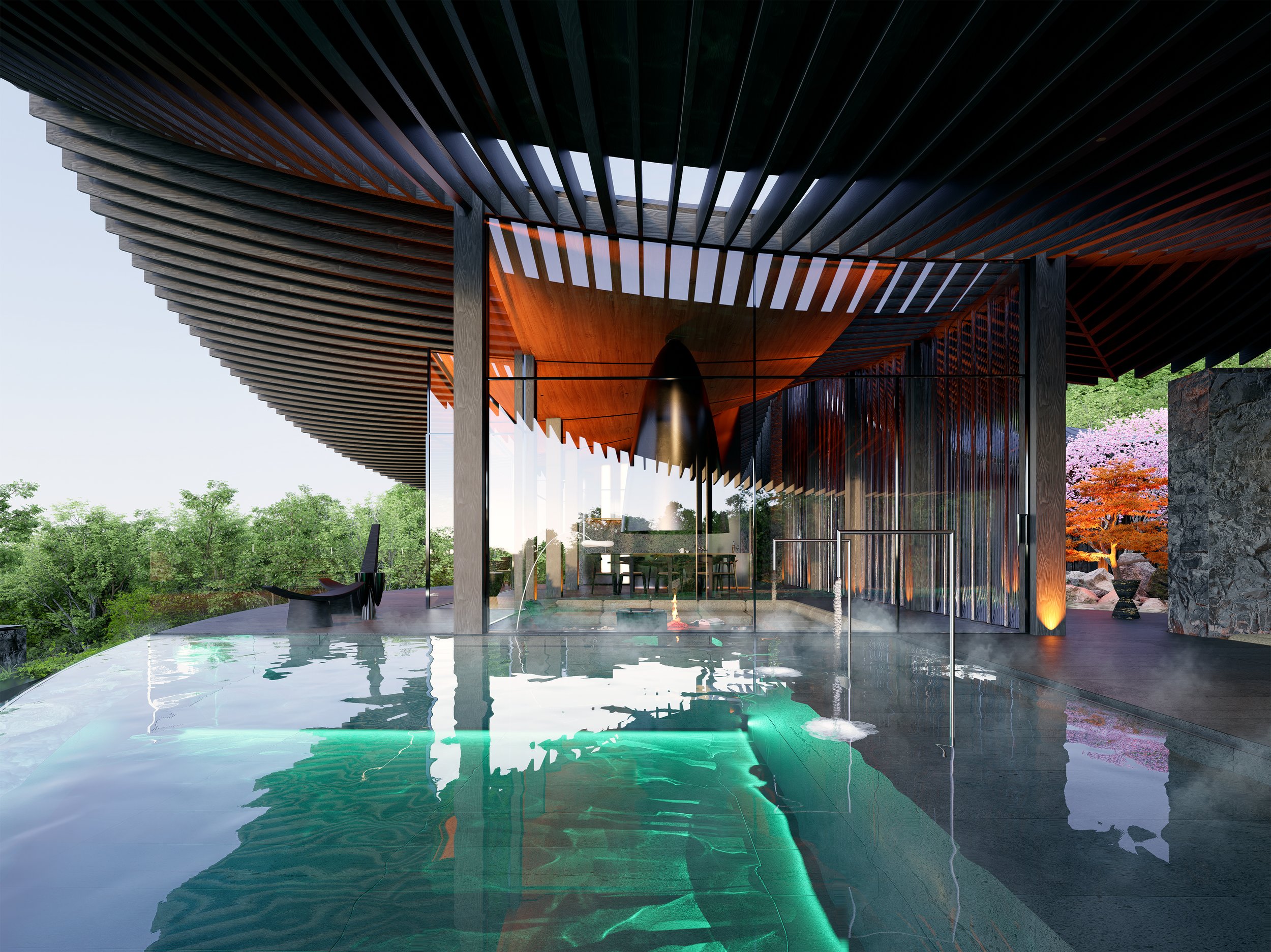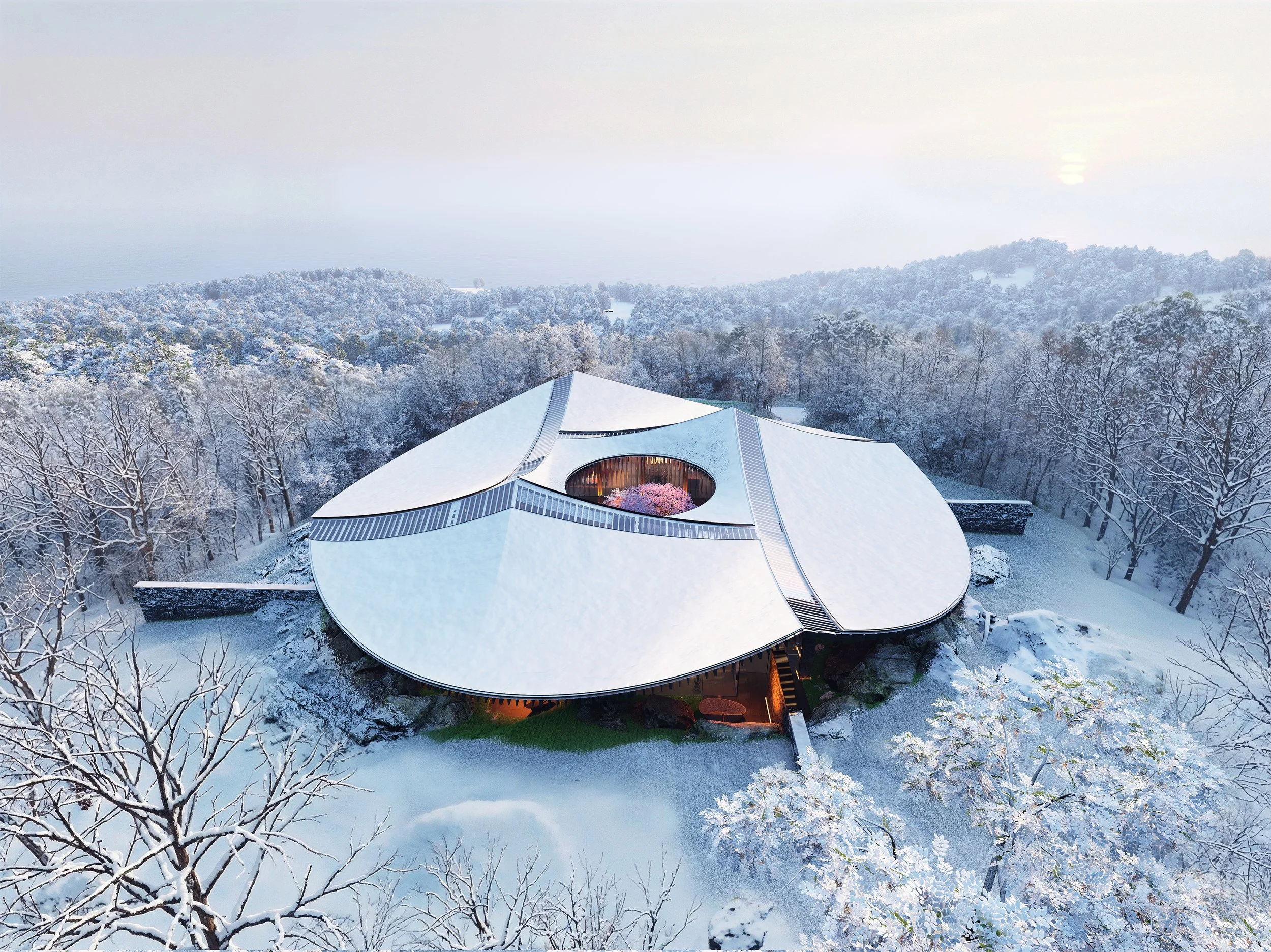 The house is conceived as a vortex in the forest. Drawing from the geometry of the Japanese Iris and the motion of a Kazaguruma (pinwheel), the plan rotates around a central, protected void. While the traditional villa looks exclusively outward, this proposal looks both out to the horizon and in to the hearth. The roofline lifts and dips like folded origami, creating a dynamic silhouette that manages sunlight and privacy simultaneously.